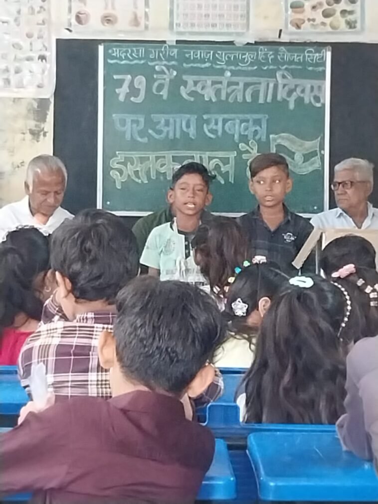 सोजत। स्वतंत्रता दिवस के पावन अवसर पर मोहल्ला सिपाहियान कुरैशियान स्थित मदरसा सुल्तानुल हिंद गरीब नवाज़ स्कूल में स्वतंत्रता दिवस बड़े उत्साह और धूमधाम से मनाया गया। कार्यक्रम की शुरुआत झंडारोहण के साथ हुई, जहां तिरंगे को सलामी देकर देश की आन, बान और शान को नमन किया गया।