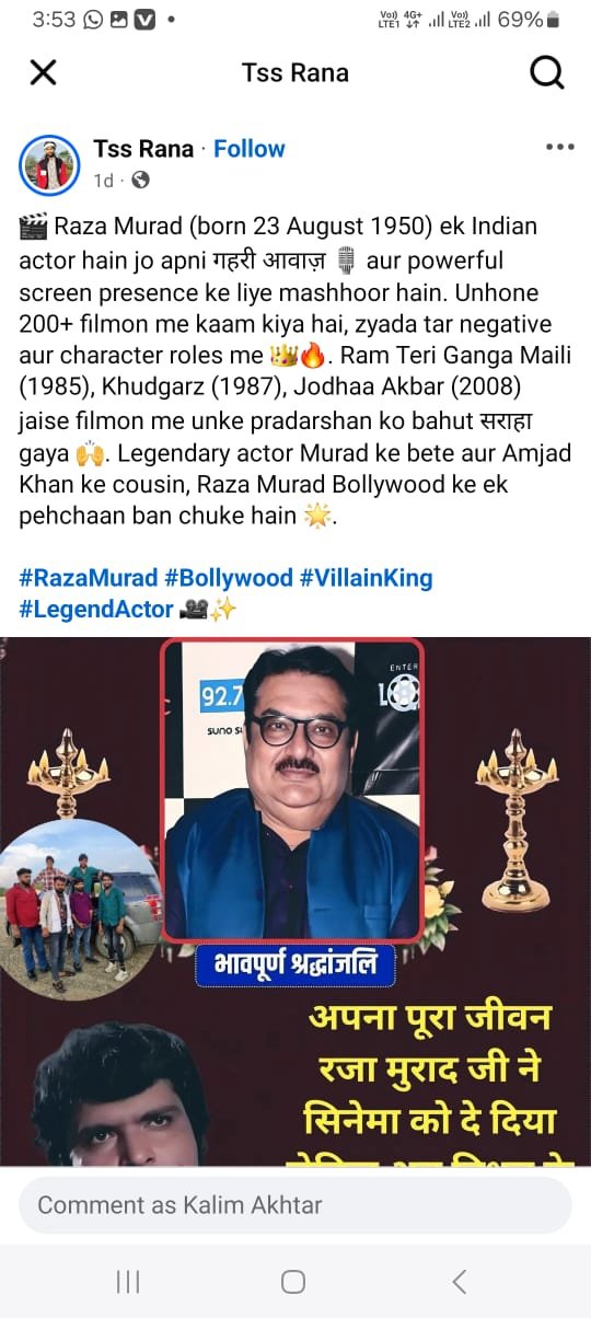 कलीम ने बताया कि 20 अगस्त 2025 को फेसबुक पर T.S.S. राणा नामक आईडी से यह फर्जी पोस्ट डाली गई, जिससे उनके साथ-साथ हजारों प्रशंसक गहरे सदमे में आ गए। इसके बाद कलीम ने खुद रजा मुराद से संपर्क कर पुष्टि की, जिस पर अभिनेता ने बताया कि वह पूरी तरह स्वस्थ हैं और यह खबर झूठी है।