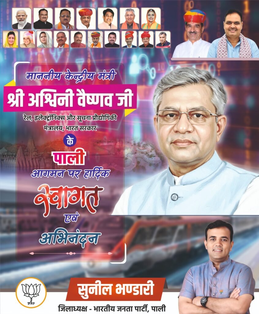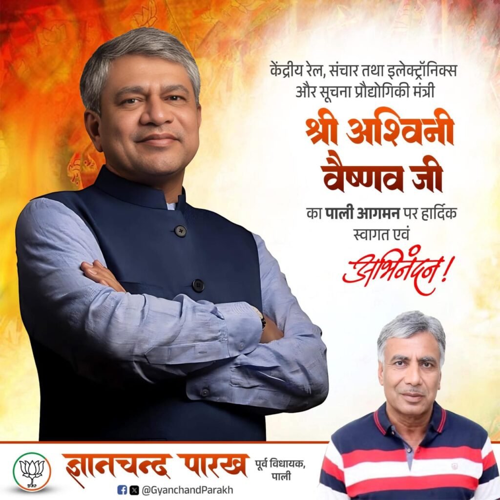 *पाली जिला मुख्यालय पर कल 25/9/2025को सुबह 5/30/बजें भारत सरकार के रेल्वे सुचना एवं प्रौद्योगिकी मंत्री श्री अश्विनी वैष्णव पाली लघु उद्योग भारती एंव सेवा समिति द्वारा संचालित स्वावलंबी भारत अभियान के अंतर्गत अलग-अलग प्रोजेक्ट का अवलोकन करने पूर्व विधायक श्री ज्ञान चंद पारख के निमंत्रण पत्र पर पाली आ रहें हैं।