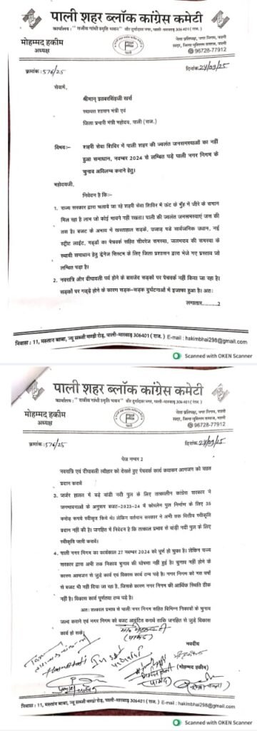 सरकार इस ज्वलंत मुद्दे पर ध्यान देकर समस्या का समाधान कर आमजन को राहत पहुंचाने का काम करें। साथ जगह-जगह जलभराव ओर मच्छरों के पनपने से भंयकर मलेरिया ओर डेंगू फैलने का खतरा है। सरकार योजना बंध तरीके से जल्द से जल्द सभी वार्डों में जलभराव ओर मच्छरों पर DDTछीड़काव करवा कर राहत दे।इस मौके पर पूर्व शहर अध्यक्ष हाजी मेहबूब भाई टी पार्षद रमेश चावला प्रकाश चौहान ताराचंद देवनानी इंसाफ मोयल मकसूद चुडी़गर युवा नेता रिजवान चढ़वा दिनेश परमार, जिशान अली रंगरेज, निर्मल तेजी युवा नेता इमरान तुंवर सहित कांग्रेस कार्यकर्ता मौजूद रहे। शहर कांग्रेस अध्यक्ष हकीम भाई ने दीपावली से पहले पहले शहर में सड़कों के निर्माण कराने की मांग की अन्यथा भाजपा सरकार के विरुद्ध जन आंदोलन की चेतावनी दी।