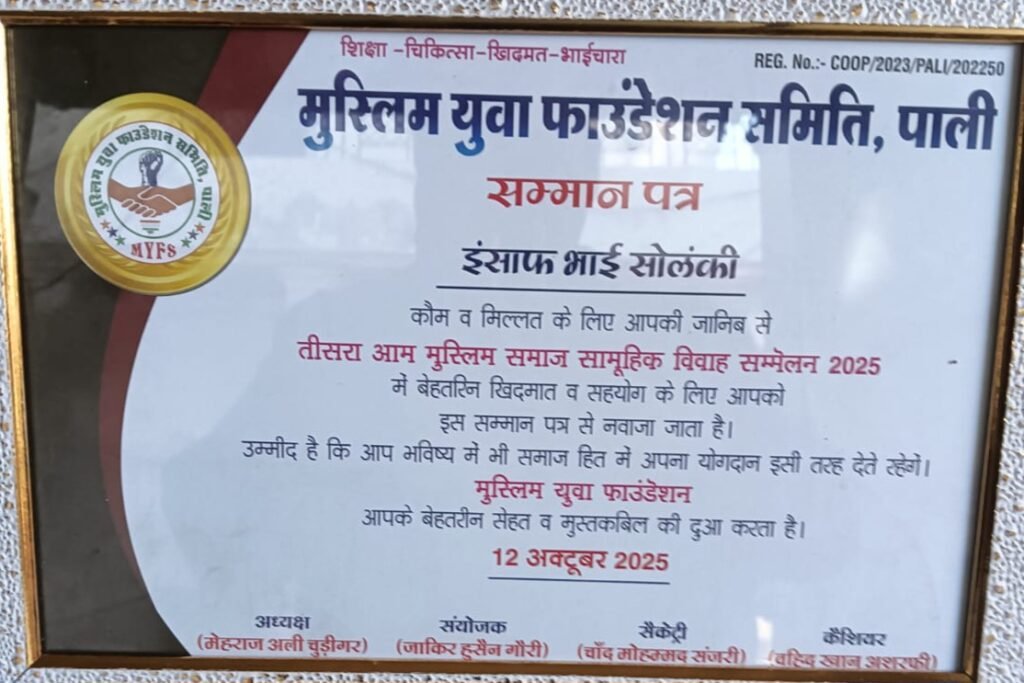 पाली जिला मुख्यालय पर गत 12दिसम्ब़र को आयोजित मुस्लिम युवा फाउंडेशन द्वारा सामूहिक निकाह सम्मेलन में मुस्लिम युवा फाउंडेशन के तमाम पदाधिकारियों व कार्यकर्ताओं व मुस्लिम घोसी समाज युवा संगठन के तमाम पदाधिकारियों व कार्यकर्ताओं सहित नगर निगम प्रशासन के अधिकारी कलीम साहब व कर्मचारियों
