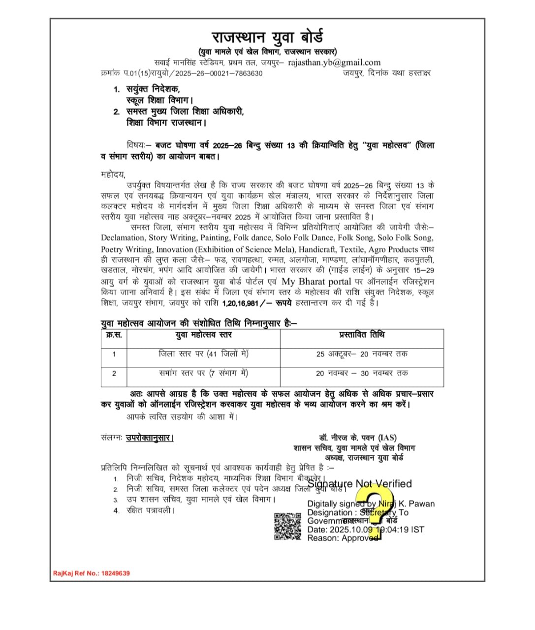 जयपुर। राजस्थान सरकार के युवा मामले एवं खेल विभाग द्वारा भारत सरकार के युवा कार्यक्रम एवं खेल मंत्रालय के निर्देशानुसार राज्य भर में युवाओं की प्रतिभा को मंच प्रदान करने हेतु “राजस्थान युवा महोत्सव 2025” का आयोजन किया जा रहा है।