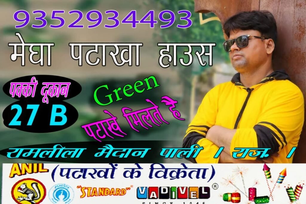 पाली जिला मुख्यालय पर स्थित रामलीला मैदान में शाॅप नंबर 27B पर दीपावली की खुशीयों में चार चांद लगाते हुए मेघा पटाख़ा हाऊस के प्रोपराइटर अनिल भाई ने आपके व आपके बच्चों की खुशीयों को दुबाला करने के लिए पटाखों की विशाल रेंज में एक से बढ़कर एक पटाख़ा लाकर धुम मचा दी है।