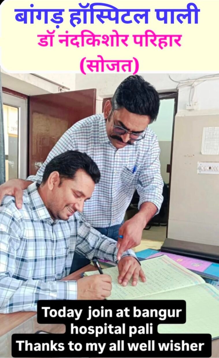 पाली, राजस्थान: पाली के बांगड़ अस्पताल (Bangur Hospital) को चिकित्सा जगत में एक और मजबूत आधार मिला है। कोटा से एक अनुभवी चिकित्सक डॉ. नंदकिशोर परिहार ने बांगड़ अस्पताल में अपनी सेवाएं फिर से शुरू कर दी हैं। डॉ. परिहार मूल रूप से सोजत सिटी के निवासी हैं और इससे पहले भी बांगड़ अस्पताल में अपनी सेवाएँ देकर क्षेत्र के लोगों का विश्वास जीत चुके हैं।