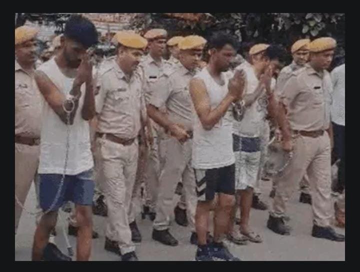 मंगलवार सुबह पुलिस ने तीन आरोपियों — महेंद्र सिंह, प्रकाश और धीरज — को कोर्ट में पेश करना था। इससे पहले इन्हें अम्बेडकर सर्किल से कोर्ट तक ढोल के साथ पैदल जुलूस में ले जाया गया। रास्तेभर पुलिस इन तीनों को घेरे रही और ढोल की थाप पर लोग आरोपियों को देख इकट्ठा होते गए।