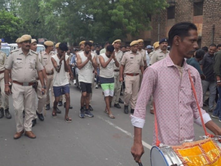 पाली। शहर में युवक जितेंद्र मेघवाल की हत्या के आरोपियों का मंगलवार को पुलिस ने ढोल-नगाड़ों के साथ जुलूस निकाला। यह नजारा देख शहरवासी दंग रह गए। आरोपियों के कपड़ों पर “हार्डकोर हिस्ट्रीशीटर” लिखा था और वे पूरे रास्ते हाथ जोड़ते हुए, लंगड़ाते हुए चल रहे थे।