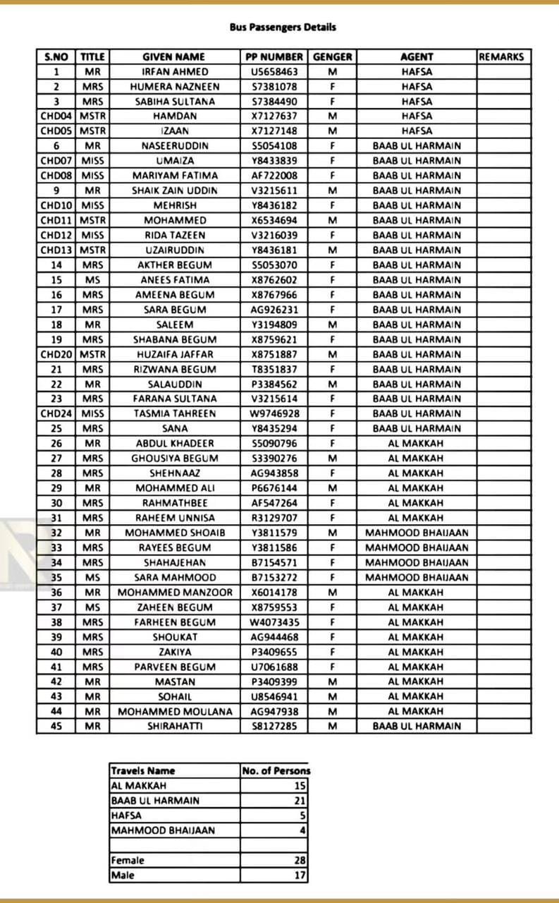 हादसे का शिकार हुए सभी लोग तेलंगाना के हैदराबाद के रहने वाले थे और उमराह की रस्में पूरी करने के बाद मदीना की ओर बढ़ रहे थे। बस में कुल 43 यात्री थे, जिनमें से सिर्फ एक व्यक्ति जीवित बचा है। उसे गंभीर हालत में अस्पताल में भर्ती कराया गया है।