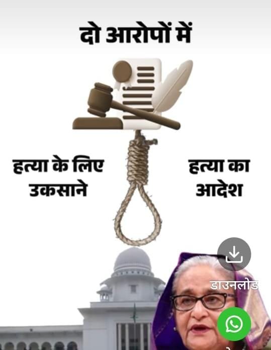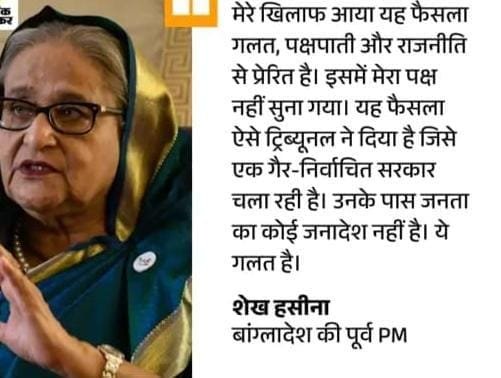 बांग्लादेश की कोर्ट ने पूर्व प्रधानमंत्री शेख हसीना व पूर्व गृहमंत्री अस्दुजंमां खान को सुनाई फांसी की सजा।