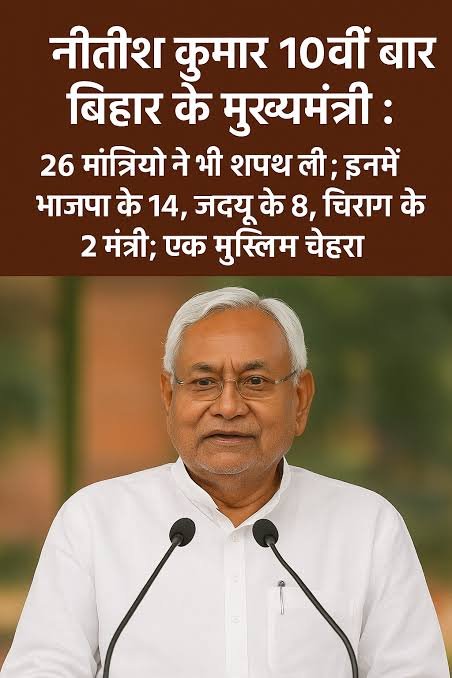 पटना। बिहार की राजनीति में एक बार फिर इतिहास रचते हुए नीतीश कुमार ने मंगलवार को 10वीं बार मुख्यमंत्री पद की शपथ ली। राजधानी पटना के गांधी मैदान में हुए भव्य समारोह में प्रधानमंत्री नरेंद्र मोदी, केंद्रीय गृह मंत्री अमित शाह, बीजेपी अध्यक्ष जेपी नड्डा सहित कई राज्यों के मुख्यमंत्री और राष्ट्रीय स्तर के नेता मौजूद रहे।