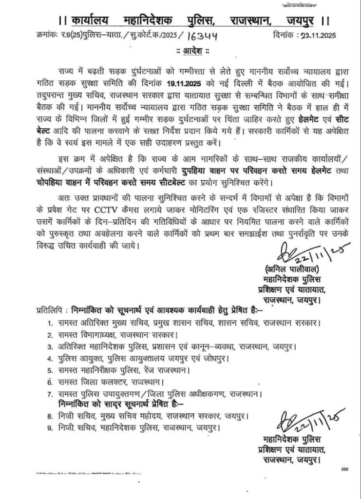 ओर आम नागरिकों सहित सरकारी उपक्रम/संस्थानों ओर राजकीय कार्यलयों व कर्मचारीयों ओर अधिकारीयों को दुपहिया वाहन ओर चार पहिया वाहन परिचालन करतें वक्त अनिवार्य रुप से हेलमेट ओर सीट बेल्ट आवश्यक रुप से लगाने के लिए निर्देशित किया।ओर उक्त आदेश की पालना के लिए विभाग के मुख्य गेट पर CCTV कैमरा लगाने ओर रजिस्टर संधारित करने के आदेश किए।साथ ही कर्मचारी के कार्यालय आते जातें समय उक्त आदेश की पालना करते रहने पर प्रोत्साहित कर पुरुस्कर्त किया जाए ओर पालना नहीं करने वाले कर्मचारियों को प्रथम बार समझाइश की जाए ओर दुबारा अवहेलना करने पर उनकै विरुद्ध उचित कार्रवाई करने को निर्देशित किया गया है। उक्त आदेश पुरे प्रदेश में पालना करवाने हेतु जारी किया गया है।*RJ22 News Pali चीफ़ एडीटर सैय्यद फैयाज बुखारी*******