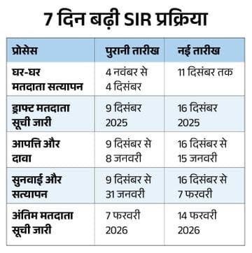 पहले निर्धारित एन्यूमरेशन पीरियड (वोटर वेरिफिकेशन) 4 दिसंबर तक था, लेकिन अब इसे बढ़ाकर 11 दिसंबर कर दिया गया है। वहीं, पहली ड्राफ्ट वोटर लिस्ट अब 9 दिसंबर की जगह 16 दिसंबर को जारी होगी।