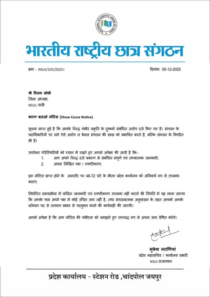 द्वारा दुष्कर्म के आरोप में रिपोर्ट दर्ज कराने की जानकारी सुचना मिलने पर NSUI के प्रदेश महासचिव/कार्यलय जयपुर प्रभारी मुकेश नराणियां ने पाली जिलाध्यक्ष विजय जोशी को कारण बताओ नोटिस जारी कर 48/72 घंटे में उक्त प्रकरण की सम्पूर्ण एंव तथ्यात्मक जानकारी से प्रदेश कार्यालय को अवगत कराने का नोटिस जारी किया गया है।ओर अपना स्पष्टीकरण लिखित में मांगा है।समय सीमा में जानकारी नही देने पर संगठन द्वारा संगठनात्मक अनुशासन के तहत आपके विरुद्ध दर्ज प्रकरण में आरोपी मानकर पदमुक्त करने की कार्रवाई अमल में लाने की कार्यवाही करेगा। प्रकरण की गंभीरता को देखते हुए प्रदेशाध्यक्ष को अपना पक्ष रखने की जानकारी का नोटिस दिया गया है। ऐसे गंभीर आरोप से कांग्रेस पार्टी ओर संगठन की साख को भारी नुक्सान होता है।