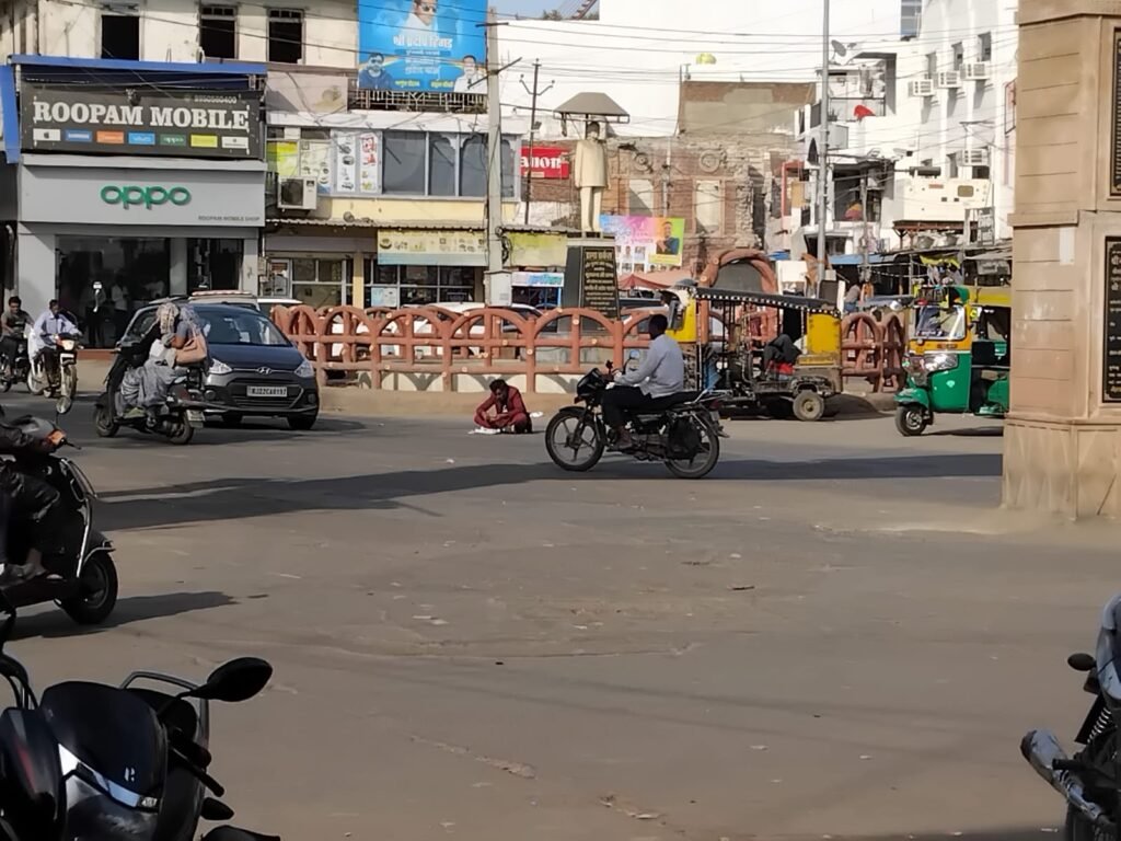 पर शराब के नशे में धूत एक शराबी वाहनो के आवागमन के बीच में तिराहे की सड़क पर बैठ कर नशे की हालत में चूर होकर बीच सड़क पर खाना खा रहा था।ओर सड़क पर हल्के व भारी वाहन आस पास से गुजर रहे थे।यह नजारा अक्सर इस तिराहे पर नज़र आ जाता है