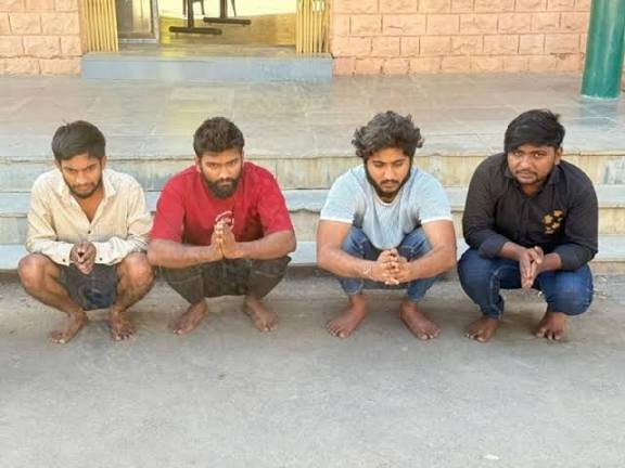 पाली जिले के खिंवाड़ा थाना पुलिस ने गुरुवार शाम पूछताछ के बाद अल्पेश (20) पुत्र भरत भाई ठाकुर निवासी वालेर, धानेरा, चिराग कुमार (20) पुत्र प्रवीण सोलंकी ठाकुर निवासी कसारी (डिसा), अजयकुमार (19) पुत्र रमेश भाई ठाकुर निवासी रमूण (डिसा) और राहुल भाई (21) पुत्र पंजी भाई ठाकुर निवासी वालेर, थाना धानेरा को गिरफ्तार किया। सभी आरोपी गुजरात के बनासकांठा जिले के रहने वाले हैं।