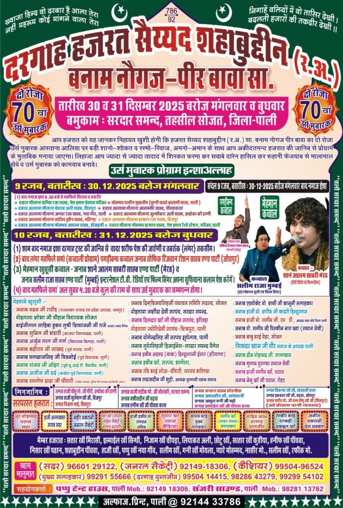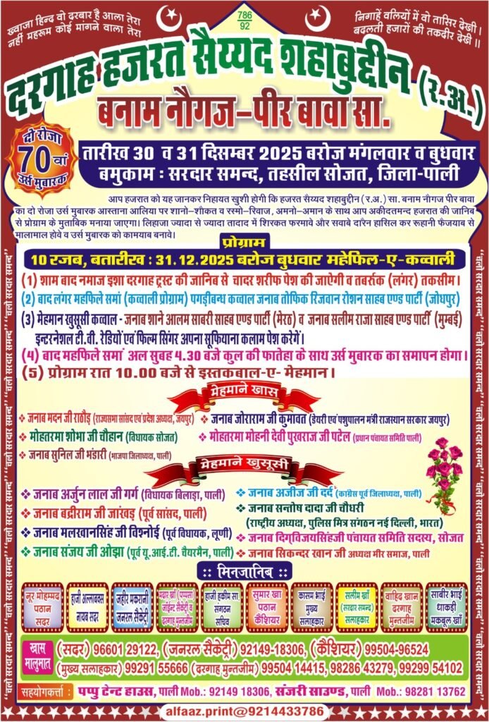 पाली जिला मुख्यालय पर आगामी 30/31/12/2025को शहंशाह ए सरदार समंद वली ए कामिल