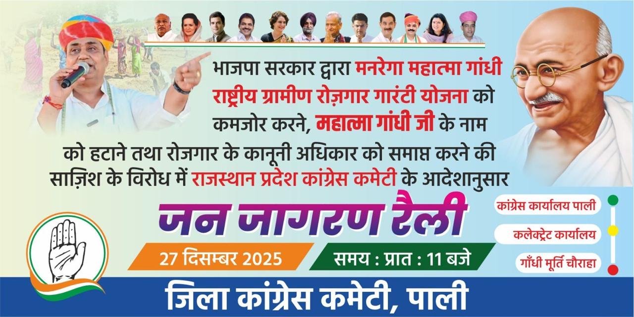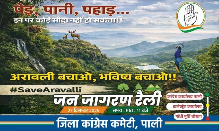 पाली | 26 दिसम्बर भाजपा की केंद्र व राज्य सरकार की नीतियों के विरोध में राजस्थान प्रदेश कांग्रेस कमेटी के आह्वान पर कल, 27 दिसंबर को पाली में एक विशाल जन-जागरण रैली का आयोजन किया जाएगा। यह रैली मुख्य रूप से ‘अरावली बचाओ जन-आंदोलन’ और ‘मनरेगा’ के संरक्षण को लेकर आयोजित की जा रही है।