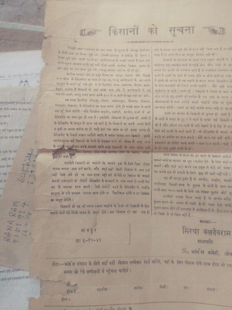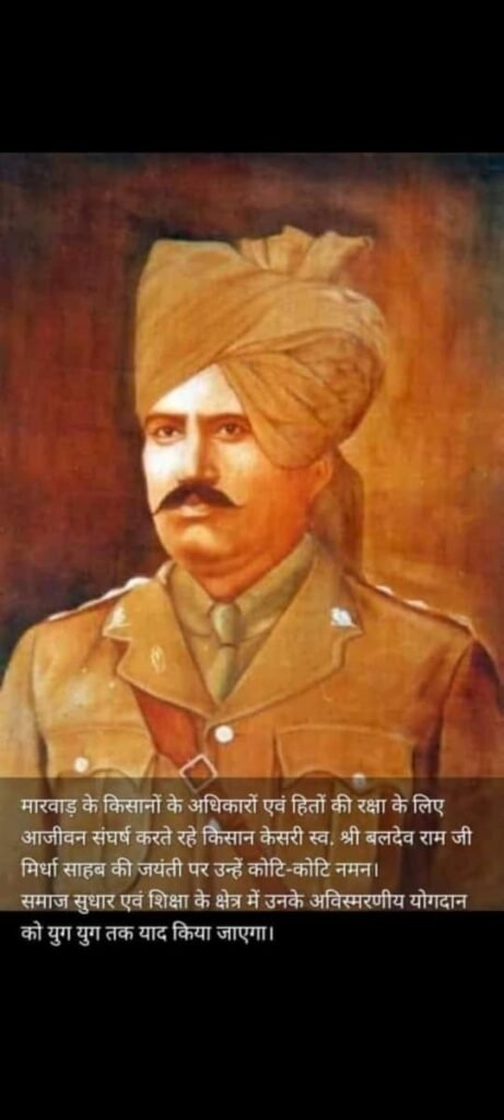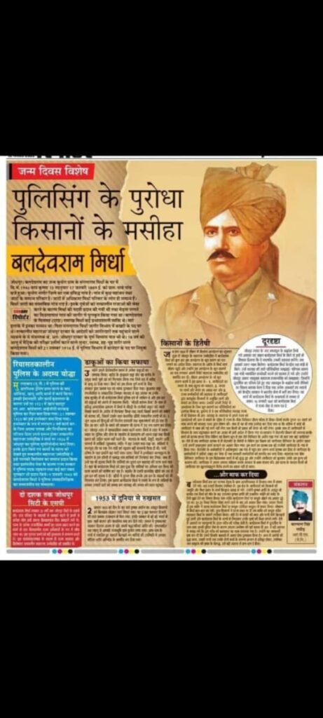 स्व* बलदेव राम मिर्धा का जन्म 17जनवरी 1889को हुआ था।आपने अपनी जिंदगी भोलेभाले गरीब किसानों के उत्थान ओर उनकी जमीनों का हक दिलवाने में मुख्य भूमिका निभाई।आपने राजा रजवाड़े के समय रियासतों में पुलिसिंग व्यवस्था में एक अदम्य योद्धा के रूप में काम कर डाकूओं का सफाया किया।