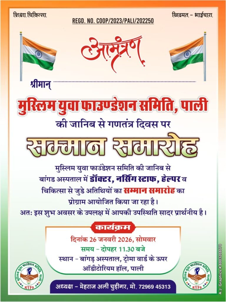 बांगड़ अस्पताल टो्मा वार्ड आडिटोरियम हाॅल में मुस्लिम युवा फाउंडेशन के बैनर तले गणतंत्र दिवस के अवसर पर भव्य स्वागत समारोह आयोजित किया जाएगा।यह जानकारी देते हुए समाजसेवी फाउंडेशन अध्यक्ष मेहराज अली चुडीगर ने बताया कि संविधान दिवस पर फाउंडेशन समिति द्वारा सेवाभावी डाक्टर्स व नर्सिंग स्टाफ व चिकित्सा सेवा से जुड़े सम्बंधित विभागों के अधिकारी गण व हेल्पर सहायकों का शानदार स्वागत कार्यक्रम आयोजित कर स्वागत किया जाएगा।सदर मेहराज अली चुडीगर ने बताया कि पीड़ित मानवता की सेवा में हमेशा अग्रणी भूमिका निभाने वाले चिकित्सा योद्धा का सम्मान कर फाउंडेशन स्वयं को गौरवान्वित महसूस करेगा। समिति के समाजसेवी मोहम्मद यासीन सबावत ने बताया कि इस सम्मान समारोह में ज्यादा से ज्यादा भागीदारी निभा कर कार्यक्रम को सफल बनाएं।*RJ22 News Pali चीफ़ एडीटर सैय्यद फैयाज बुखारी********