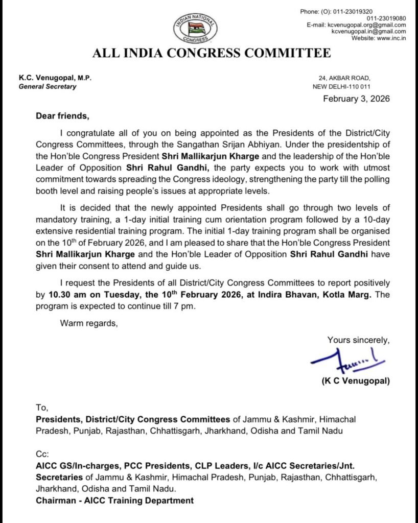 दिल्ली प्रवास के दौरान कांग्रेस जिलाध्यक्ष शिशुपाल सिंह निम्बाडा जिले की संगठनात्मक विषयों पर एवं आगामी पंचायतीराज व निकाय चुनाव को लेकर विस्तृत चर्चा करेंगे। राजस्थान कांग्रेस में संगठन सृजन अभियान का टास्क पूरा होने के बाद अब पार्टी ने अगले चरण की रणनीति पर काम शुरू कर दिया है। जिला अध्यक्षों के चयन की प्रक्रिया पूरी होते ही कांग्रेस अब उन्हें ट्रेनिंग के जरिए मैदान में उतारने की तैयारी में है। इसी कड़ी में 10 फरवरी को सभी नवनियुक्त जिला अध्यक्षों को दिल्ली बुलाया गया है, जहां कांग्रेस नेता राहुल गांधी खुद उन्हें प्रशिक्षण देंगे और नया सियासी टास्क सौंपेंगे। दिल्ली स्थित इंदिरा भवन में जिला अध्यक्षों की एक दिवसीय ट्रेनिंग वर्कशॉप आयोजित की जाएगी। वर्कशॉप में संगठन संचालन, नेतृत्व क्षमता, चुनावी रणनीति और विचारधारा जैसे अहम विषयों पर विशेषज्ञों की ओर से प्रशिक्षण दिया जाएगा।
