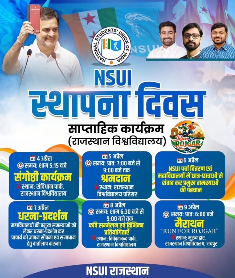 NSUI द्वारा 4 अप्रैल से 9 अप्रैल तक विभिन्न कार्यक्रम आयोजित किए जा रहे हैं, जिनमें संगोष्ठी, श्रमदान, पर्चा वितरण, छात्र संवाद, धरना-प्रदर्शन, कवि सम्मेलन एवं “Run for Rojgar” मैराथन शामिल हैं। इन आयोजनों के माध्यम से युवाओं को रोजगार एवं शिक्षा से जुड़े मुद्दों पर जागरूक करने का प्रयास किया जा रहा है।