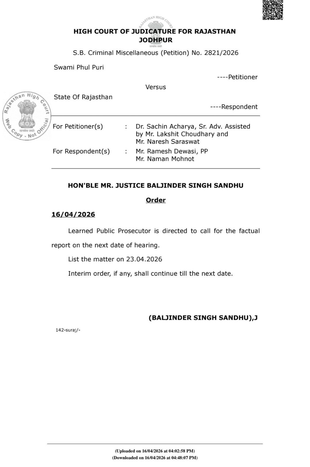 जोधपुर, 16 अप्रैल 2026। ओम आश्रम, जाडन से जुड़े बहुचर्चित मामले में राजस्थान उच्च न्यायालय ने एक बार फिर महत्वपूर्ण अंतरिम राहत प्रदान करते हुए स्वामी फूल पुरी के विरुद्ध दर्ज FIR पर रोक को जारी रखा है। न्यायालय ने मामले की गंभीरता को देखते हुए पुलिस को विस्तृत स्टेटस रिपोर्ट प्रस्तुत करने के निर्देश दिए हैं।