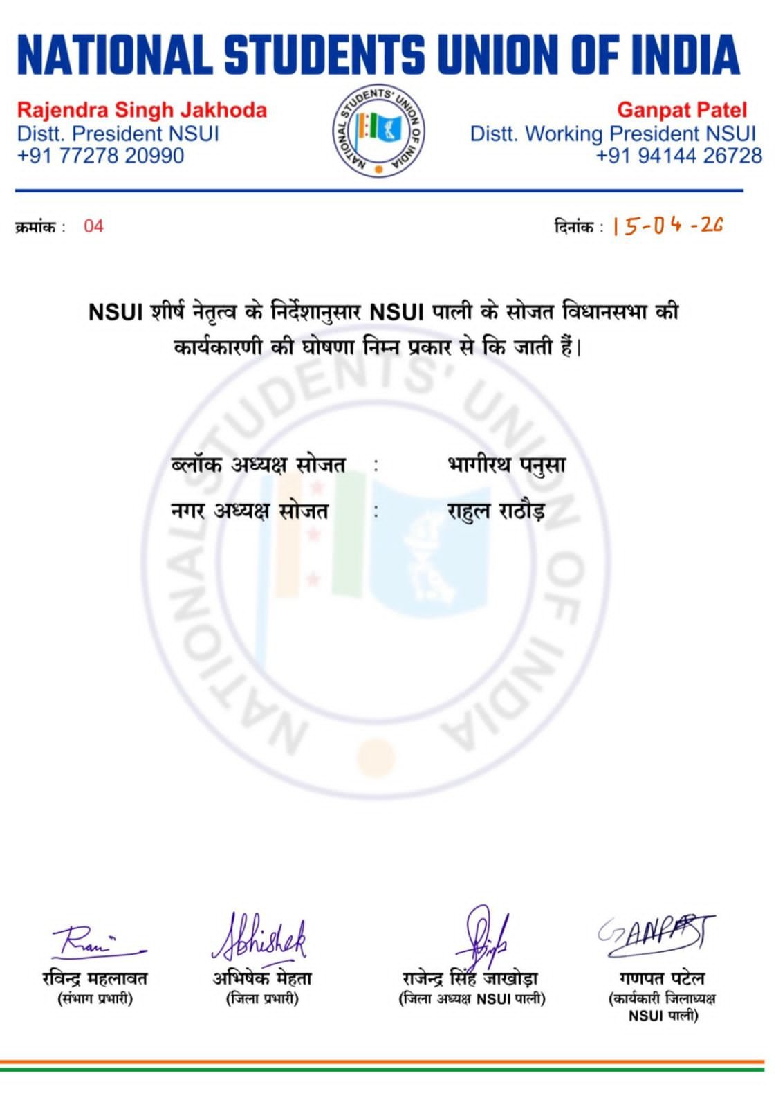 NSUI के शीर्ष नेतृत्व के निर्देशानुसार की गई इन नियुक्तियों में संगठन को और अधिक मजबूत बनाने पर जोर दिया गया। इस दौरान NSUI के राष्ट्रीय अध्यक्ष विनोद जाखड़, पाली जिला अध्यक्ष राजेंद्र सिंह जाखोड़ा एवं जिला कार्यकारी अध्यक्ष गणपत पटेल के नेतृत्व में संगठन विस्तार की बात कही गई।