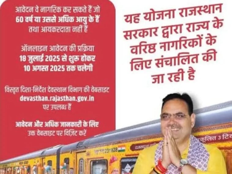 जोधपुर/पाली। राजस्थान सरकार के देवस्थान विभाग द्वारा वरिष्ठ नागरिकों के लिए संचालित तीर्थ यात्रा योजना 2025-26 हेतु ऑनलाइन आवेदन प्रक्रिया शुरू हो गई है, जो कि 10 अगस्त, रविवार तक जारी रहेगी। इस योजना के अंतर्गत राज्य के 60 वर्ष या उससे अधिक आयु के गैर-आयकरदाता नागरिक पवित्र तीर्थ स्थलों की यात्रा के लिए आवेदन कर सकते हैं।