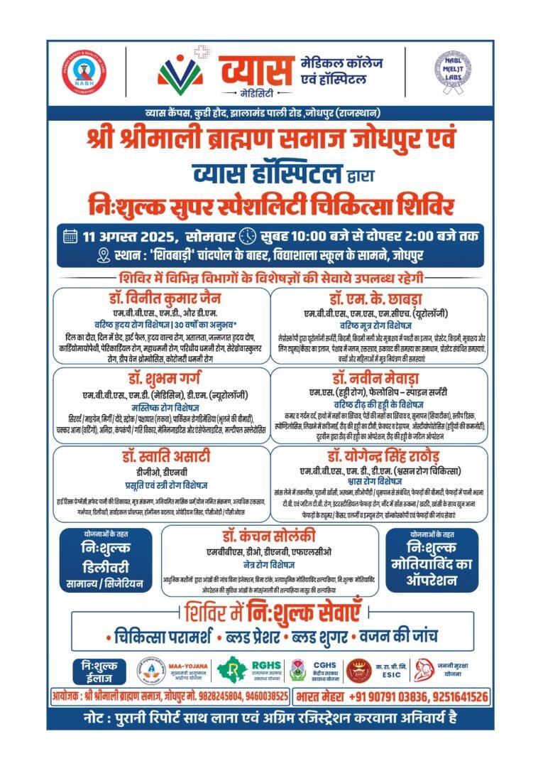जोधपुर। श्री श्रीमाली ब्राह्मण समाज जोधपुर और व्यास हॉस्पिटल के संयुक्त तत्वावधान में 11 अगस्त 2025 (सोमवार) को प्रातः 10 बजे से दोपहर 2 बजे तक एक निशुल्क सुपर स्पेशियलिटी चिकित्सा शिविर आयोजित किया जाएगा। यह शिविर चांदपोल के बाहर स्थित समाज भवन ‘शिवबाड़ी’ में होगा।
